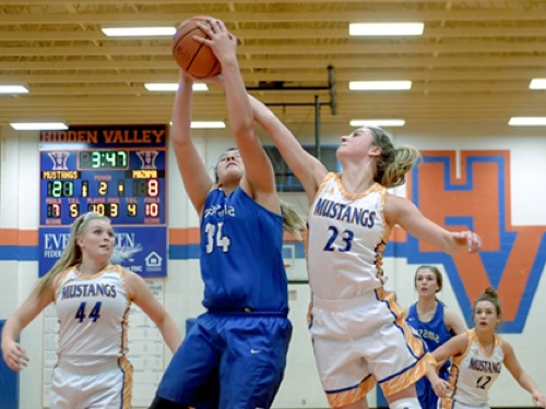 Photo by JOEL TAKARSH/for The Daily Courier, PIC #0505 (L to R) HV #44, MZ #34, HV #23, MZ #2, HV #12 Mustangs win it easily 62-31.
