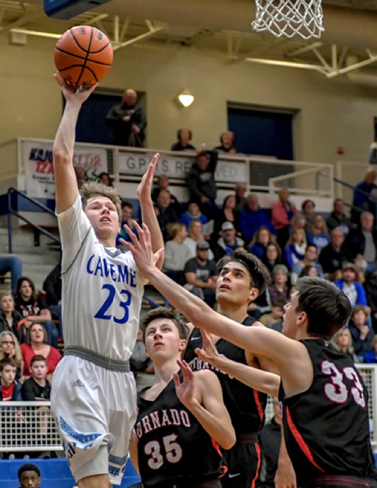 Photo by JOEL TAKARSH/for The Daily Courier, PIC #0421 (L to R) GP #23, MFD #35, MFD #44, MFD #33 Cavemen go down to North Medford 71-56.
