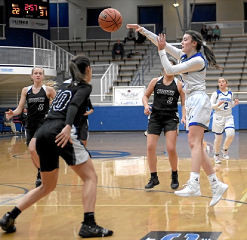 Photo by JOEL TAKARSH/for The Daily Courier, PIC #0480 (L to R) SM #5, SM #10, SM #2, GP #5 Lady Cavers can't get the upper hand. Lose it 69-58