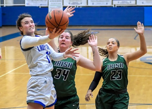 Photo by JOEL TAKARSH/for The Daily Courier, PIC #0598 (L to R) GP #11, SHLD #34, SHLD #23 LADY CAVERS can't handle The IRISH. Lose it 47-32.