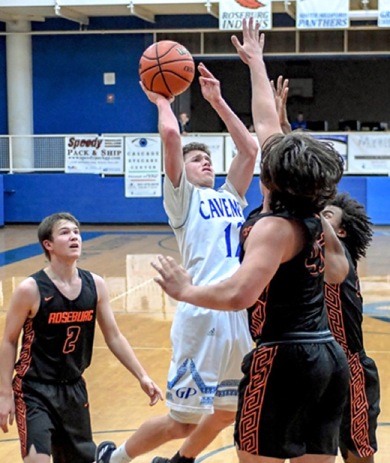 Photo by JOEL TAKARSH/for The Daily Courier, PIC #0406 (L to R) RB #2, GP #12, RB #42 Cavemen win it 52-46!