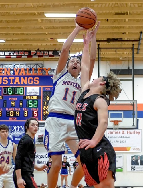 Photo by JOEL TAKARSH/for The Daily Courier, PIC #0299 (L to R) HV #24, KU #0, HV #11, KU #11 Mustangs can't pull this one out. Lose it 60-53.