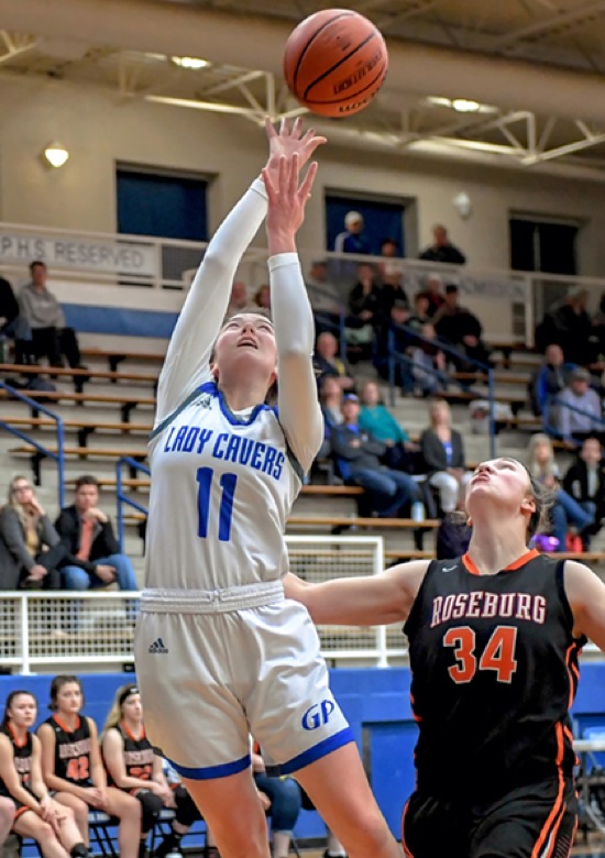 Photo by JOEL TAKARSH/for The Daily Courier, PIC #0176 (L to R) GP #11, RB #34 Lady Cavers easily handle Roseburg 69-24.