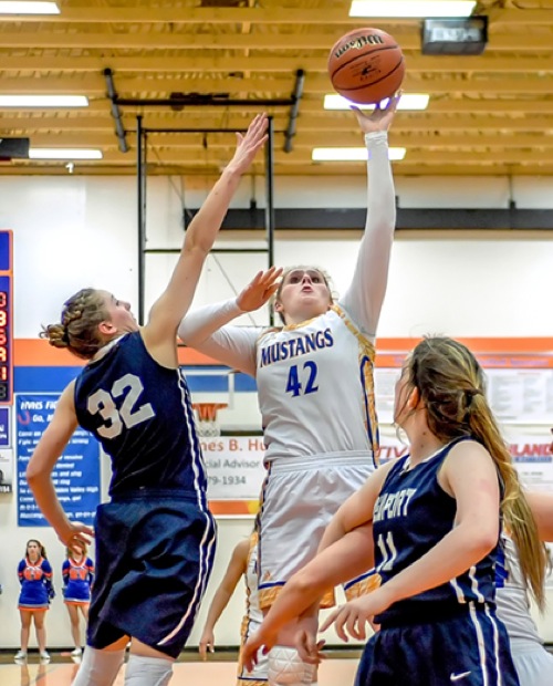 Photo by JOEL TAKARSH/for The Daily Courier, PIC #1235 (L to R) NP #32, HV #42, NP #11 Lady Mustangs can't pull off the win. Lose it 37-31.