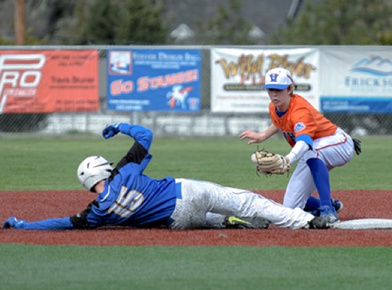 Photo by JOEL TAKARSH/for The Daily Courier, PIC #0263 Close call as Cottage Grove #15 slides to get back to 2nd base and HV #9's tag is just late - SAFE!