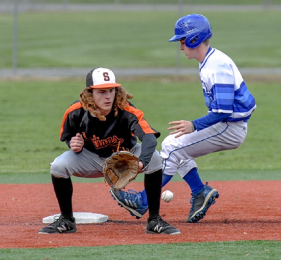 Photo by JOEL TAKARSH/for The Daily Courier, PIC #0550 (2nd inning) GP #8 is just ahead of the ball for a stand-up steal of 2nd base Cavemen win it 13-3.