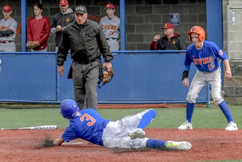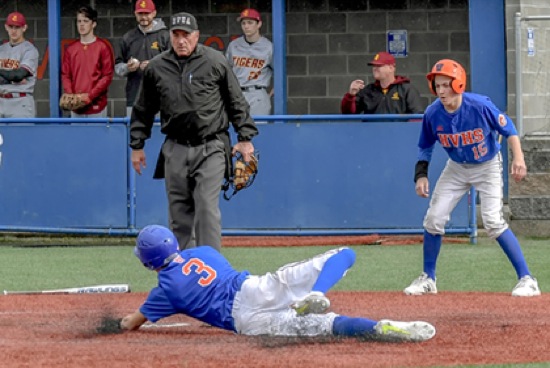 Photo by JOEL TAKARSH/for The Daily Courier, PIC #0208 (2nd inning) HV #3 goes in for the slide at home plate for HV's 3rd run Mustangs win it 11-1!