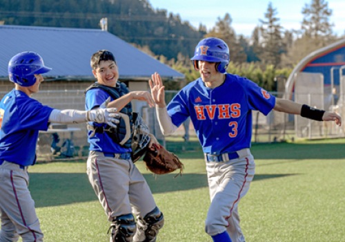 Photo by JOEL TAKARSH/for The Daily Courier, PIC #0757 (6th inning) HV #7(Left) and HV #10(center) HI-5 HV #3 after his 2 run homer in the 6th inning Mustangs win big - 15-4.