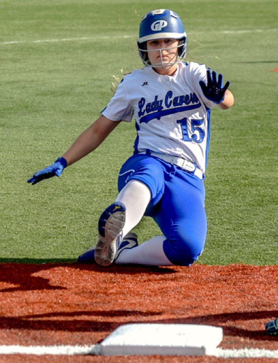 Photo by JOEL TAKARSH/for The Daily Courier, PIC #0484 GP #15 slides into 3rd base Lady Cavers win big 15-0 !