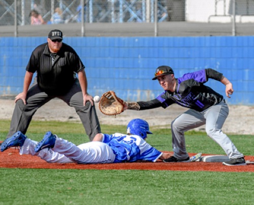 Photo by JOEL TAKARSH/for The Daily Courier, PIC #0178 (2nd inning) Attempting to pick off GP #13 at first base, the throw is late - SAFE Cavemen win a nail-biter 8-7 !