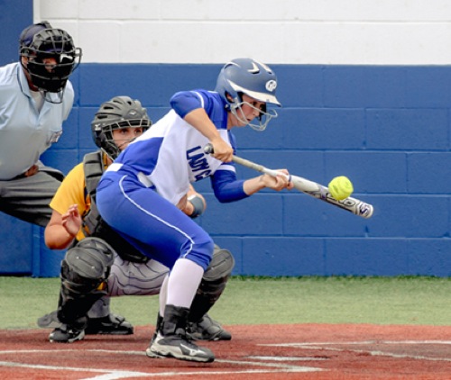 Photo by JOEL TAKARSH/for The Daily Courier, PIC #0427 (3rd inning) GP #1 delivers siuccessful bunt. Lady Cavers win big...11-1!