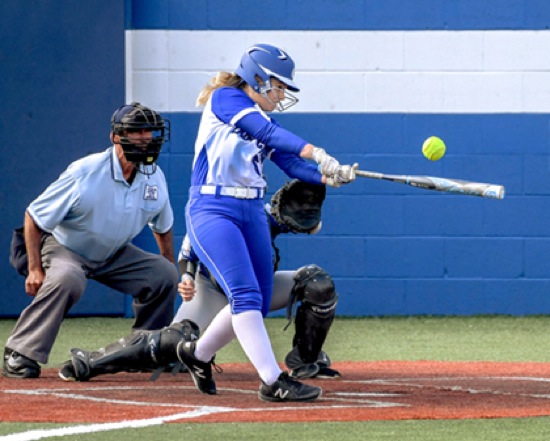 Photo by JOEL TAKARSH/for The Daily Courier, PIC #0177 (1st inning) GP #5 connects for an RB double Lady Cavers win big...20-2!
