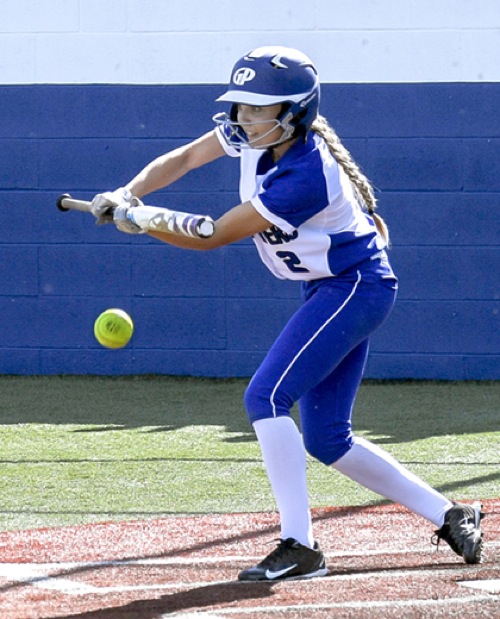 Photo by JOEL TAKARSH/for The Daily Courier, PIC #0356 (2nd inning) GP #2 drops a bunt. Lady Cavers advance winning 12-2!
