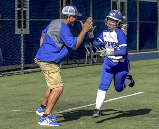 PIC #0432(2nd inning) Head Coach Donnie Bellum Hi-5's GP #5 rounding 3rd base after her grand slam homerun.