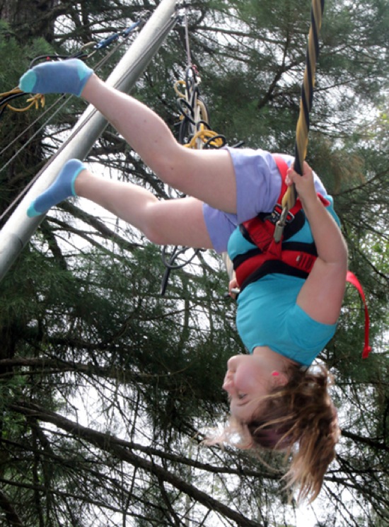 TIMOTHY BULLARD/Daiy Courier Raegan Weather, 8, goes topsy-turfy in a flip on the bungee jump at the Boatnik in Riverside Park Saturday.