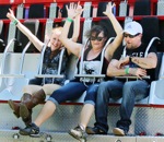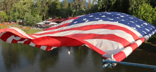 A giant American Flag billows out over the Rogue River from the Seventh Street Bridge and overlooking the action at the Boatnik in Riverside Park Sunday.