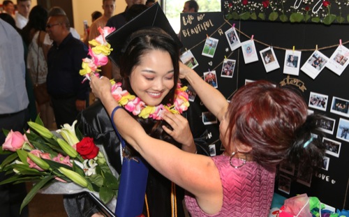 TIMOTHY BULLARD/Daily Courier Hanna Nguyen gets a floral lai from her aunt Tan Ellie after graduating from New Hope Christian School Saturday. TEASE GALLERY