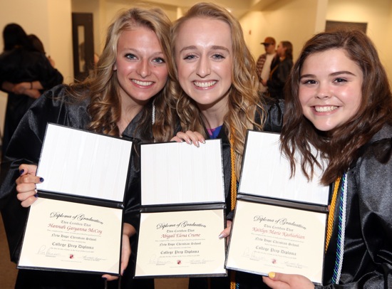 Proud to show off their diplomas after being graduated, New Hope Christian alumni Hannah McCoy, Abigail Crume and Kaitlyn Kashishian proudly show off their diplomas.