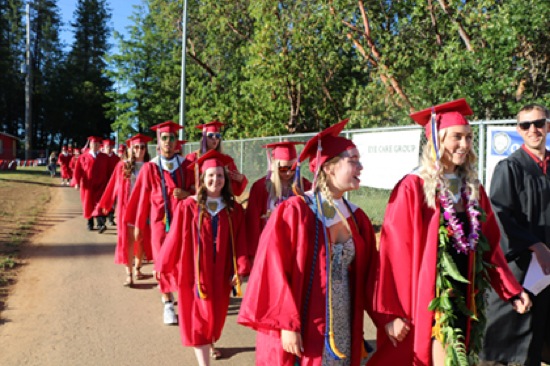 JASON McMILLEN/Daily Courier Valedictorian Aarika Brooks (right) leads Illinois Valley High School's class of 2019 to the ceremony area on the school's football field.