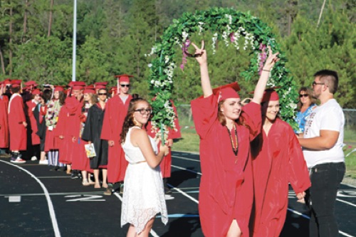 Samantha Cooper, accompanied by her friend Kaylee Dougherty, throws up peace signs following a rowdy round of applause from the crowd at Illinois Valley High School's 2019 graduation.