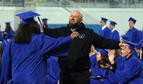 TIMOTHY BULLARD/Daily Courier Scott Wakefield, girls basketball coach, congratulates a Grants Pass High School graduate Friday.