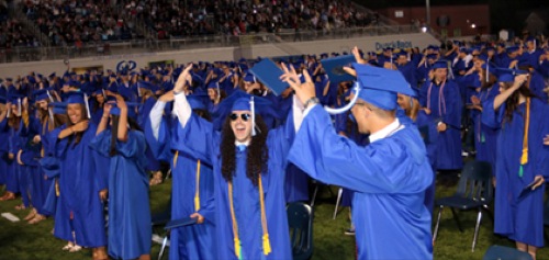 TIMOTHY BULLARD/Daily Courier Blain Hobbs (sunglasses) and Corbin Anderson (right) celebrate after being proclaimed graduated at Grants Pass High School on Friday.