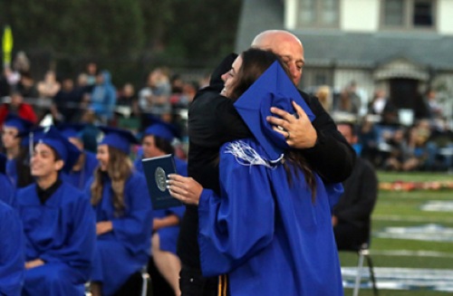 TIMOTHY BULLARD/Daily Courier Scott Wakefield, girls basketball coach congratulates Ayla Klinger, one of his team members at the Grants Pass High School graduation Friday.