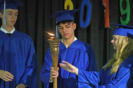 Brighton Academy students (from left) Connor Brown, Daniel Mackay and Katie DeGeyter participate in a symbolic passing of the torch during the school's graduation ceremony Saturday.