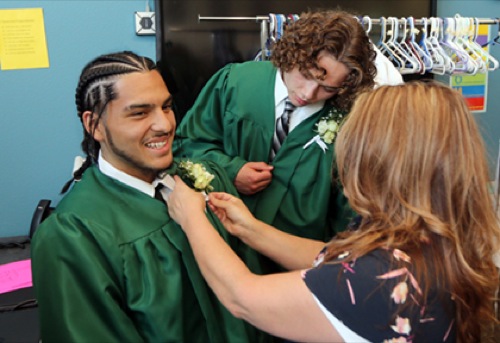 Jarrod L. (background) watches as Living Unit Manager Amy Bailey attaches a boutonniere to the graduation gown of Kaden M. before the graduation ceremony at the New Bridge High School Youth Correctional Facility Thursday.