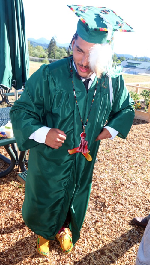 Kaden M. dances in the new moccasions his family hand made for him as a graduation present. The Modoc family lives in southern and eastern Oregon, "And we all had a part of making the moccasions and beads for him," his sister said.