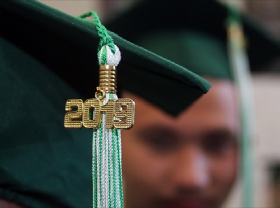 Ben S. sports a "2019" tassel insignia on his mortar board as his friend Brice S. watches in the background before the graduation ceremony at the New Bridge High School Youth Correctional Facility Thursday. "It's not often you get to graduate with your best friend," Brice said.