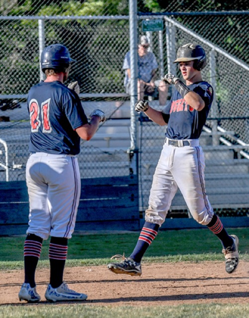 Photo by JOEL TAKARSH/for The Daily Courier, PIC #0370 (2nd inning) GP #5 greeted by GP #21 after scoring Nuggets first run Nuggets can't pull out Game #1 - lose it 10-7