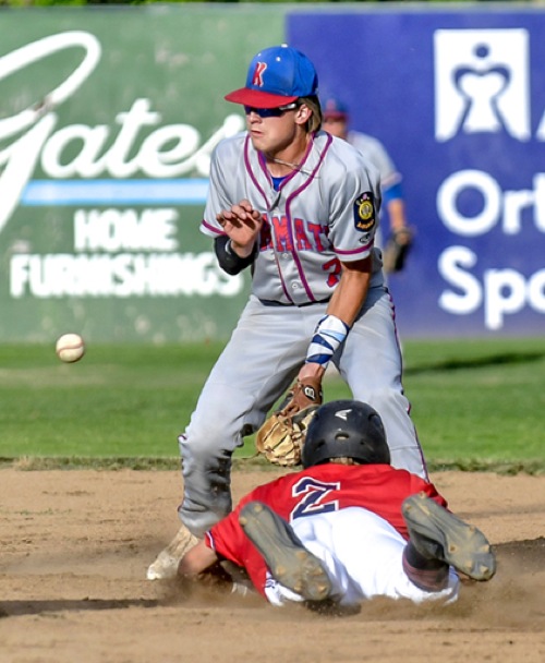 PIC #0526 (2nd inning) Nuggets #2 steals 2nd base sliding head-first to beat the throw to Klamath Falls player #7 - SAFE!
