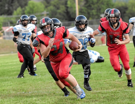 Photo by JOEL TAKARSH/for The Daily Courier, PIC #0528 Glendale #24 picks up a Chiloquin fumble and runs it in for a TD. Glendale wins big...64-16.