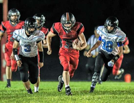 Photo by JOEL TAKARSH/for The Daily Courier, PIC #0532 Glendale #36 picks up a Chiloquin fumble and runs it down field for a TD. Glendale wins big...64-16.
