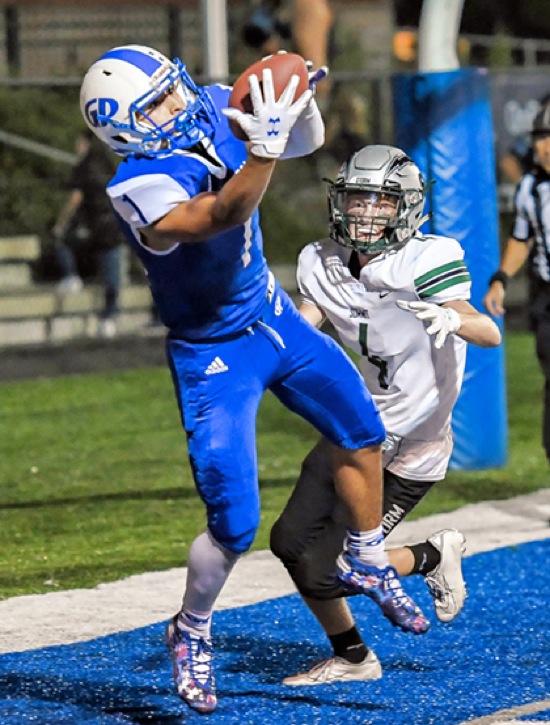 Photo by JOEL TAKARSH/for The Daily Courier, PIC #0644 GP #1 makes TD catch at end of 2nd quarter as time runs out. Summit #4 defends Cavemen win it 12-7.