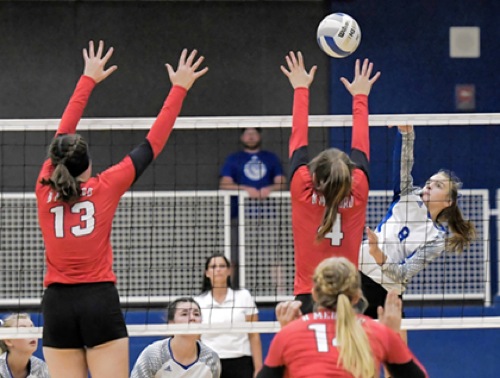 Photo by JOEL TAKARSH/for The Daily Courier, PIC #0069 (L to R) NM #13, GP #9(below net), NM #14, NM #4, GP #8 Tough night for Lady Cavers. Lose it 3 sets to 0.