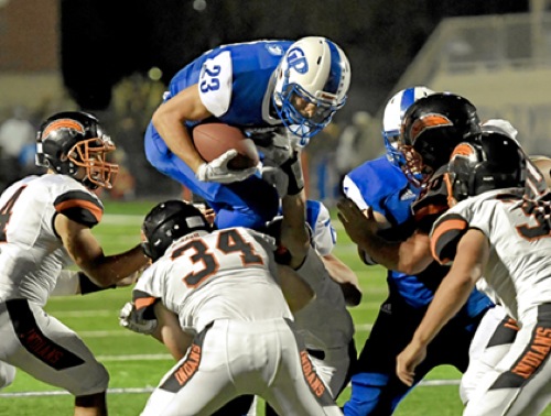 Photo by JOEL TAKARSH/for The Daily Courier, PIC #0783 GP #23 carries the ball Cavemen win it 42-21 !!
