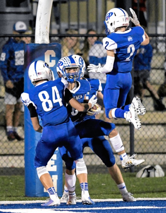 Photo by JOEL TAKARSH/for The Daily Courier, PIC #0196 (L to R) GP #84, GP #9, GP#2 celebrate a GP TD. Cavemen win it 42-21 !!
