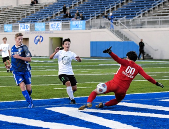 Photo by JOEL TAKARSH/for The Daily Courier PIC #0050 GP #12 watches as his kick goes by the Sheldon goalie for a goal Cavemen win it 5-0
