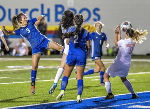 Photo by JOEL TAKARSH/for The Daily Courier PIC #0450 GP #3 kicks the ball past RSB goalie #00 for GP's 3rd goal Lady Cavers win it 3-1 !