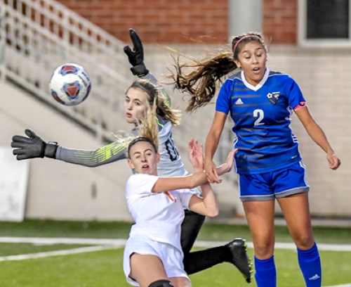 Photo by JOEL TAKARSH/for The Daily Courier PIC #0203 (L to R) RSB goalie #00, RSB #11, GP #2 Lady Cavers win it 3-1 !