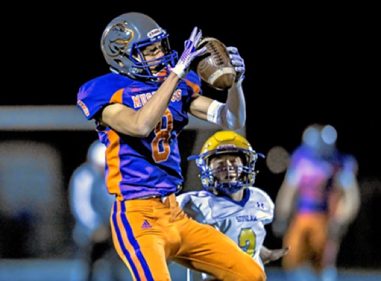 Photo by JOEL TAKARSH/for The Daily Courier PIC #0182 HV #8 makes catch for huge gain and first down. SLW #3 attempts to defend Mustangs win big 40-12 !!