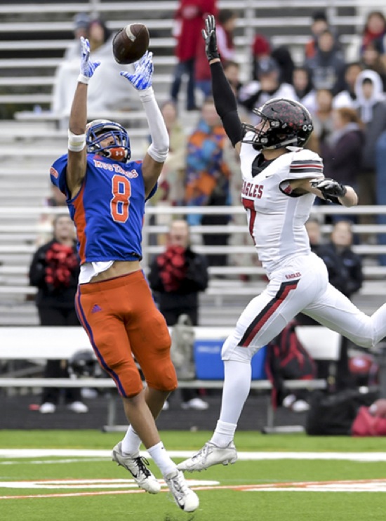 Photo by JOEL TAKARSH/for The Daily Courier PIC #0277 HV #8 makes this catch for a big gain. SC #7 defends
