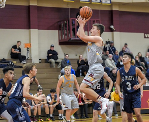 Photo by JOEL TAKARSH/for The Daily Courier PIC #0691 (L to R) ST.M #34, ST.M #10, NV #35, NV #4(shooting), ST.M #3 Knights win it 48-39 !