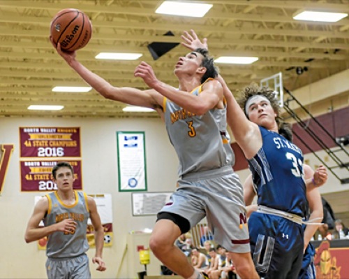Photo by JOEL TAKARSH/for The Daily Courier PIC #0380 (L to R) NV #23, NV #3, ST.M #33 Knights win it 48-39 !