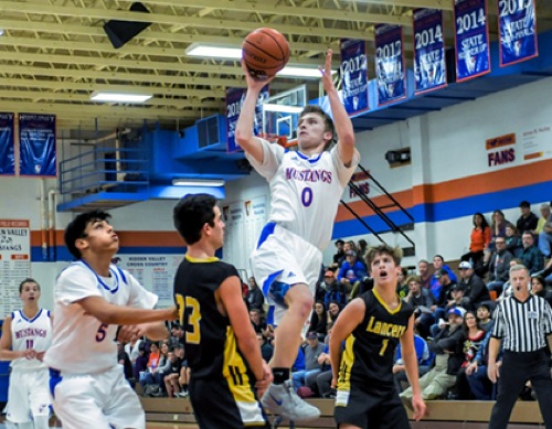 Photo by JOEL TAKARSH/for The Daily Courier PIC #0336 (L to R) HV #11, HV #5, SU #23, HV #0, SU #1 Mustangs win it 86-49 !