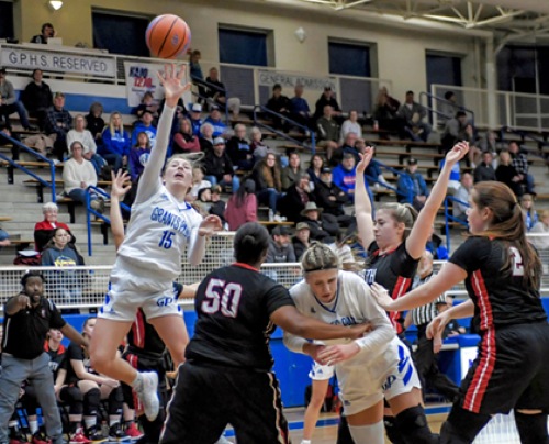 Photo by JOEL TAKARSH/for The Daily Courier PIC #0056 (L to R) GP #15, NM #50, GP #33, NM #3, NM #20 Lady Cavers cave late in the game to lose it 33-30.