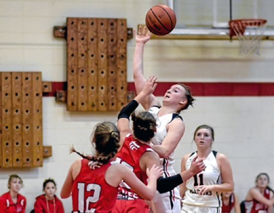Photo by JOEL TAKARSH/for The Daily Courier PIC #0199 (L to R) DC #12, DC #10, NHC #5, NHC #11 The Lady Warriors can't handle Days Creek...lose it 41-24.