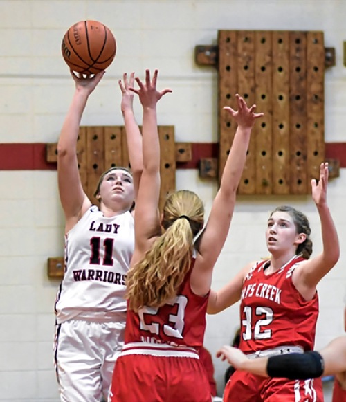 Photo by JOEL TAKARSH/for The Daily Courier PIC #0170 (L to R) NHC #11, DC #23, DC #32 The Lady Warriors can't handle Days Creek...lose it 41-24.
